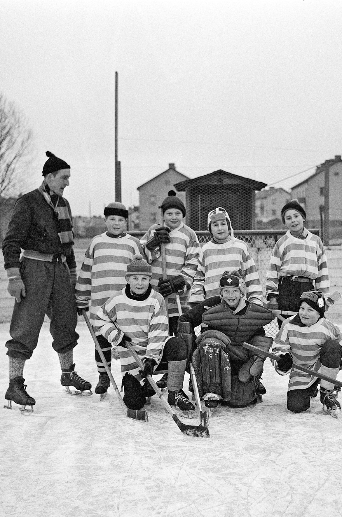 Bilden här ovan är på fotbollsproffset Sigge Löfgren med sju yngre hockeykillar på Brunnsrinken i Ronneby 1959.